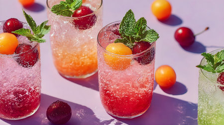 Refreshing colorful drinks in clear glasses, garnished with mint and fruits, arranged on a pastel surface, perfect for summer gatherings and festive occasions