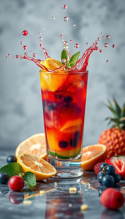Vibrant tropical sunrise cocktail with playful splashes and colorful fruit accents