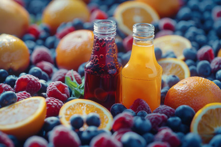 Two glass bottles filled with bright juices sit amid a lush display of oranges, blueberries, and raspberries, showing a delightful blend of colors and flavors in a summer-inspired feast.