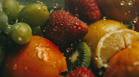 A striking image of assorted fruits splashing in a clear bowl, showcasing vibrant colors and refreshing appeal, ideal for promoting healthy eating and culinary creativity.