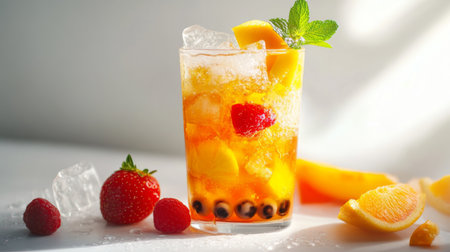 A vibrant fruit cocktail featuring ice, strawberries, and mango, garnished with mint, perfect for summer gatherings and refreshing moments.