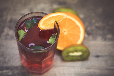 Cold drink black tea of raspberry lemonade with mint in glass. Selective focus