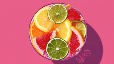 A vibrant display of citrus slices including lemon, lime, and orange floating in clear water, set against a bright pink background, perfect for summer hydration.
