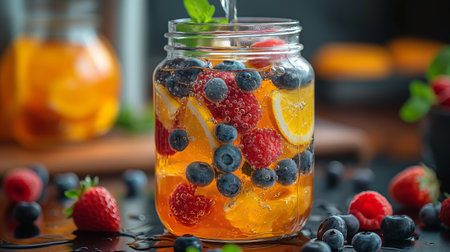 A vibrant mason jar brimming with detox fruit infused water, garnished with fresh berries and citrus slices.