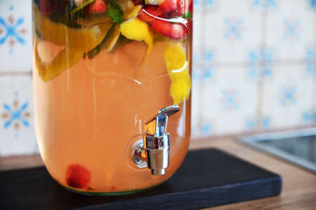 Big pitcher of cold fresh squeezed homemade lemonade made from lemon, strawberry and mint leaves, standing on the kitchen table. Small depth of field