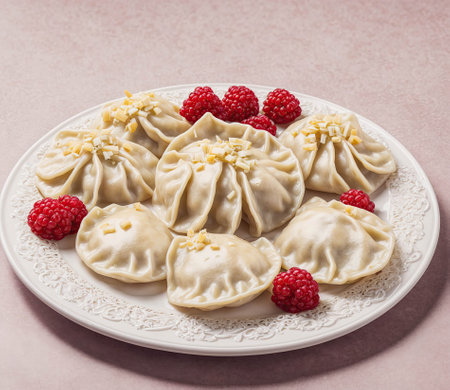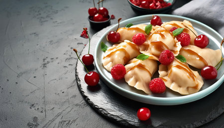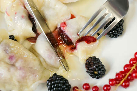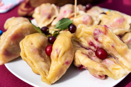 Dumplings with cherries on a plate in cafe