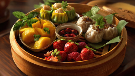 A delightful assortment of colorful dim sum served in a bamboo steamer, featuring various dumplings and fresh fruits for a luxurious dining experience.