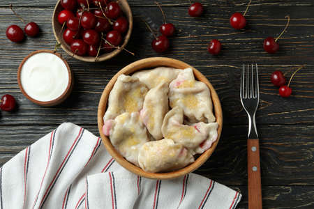 Concept of tasty food with pierogi with cherry on rustic wooden table