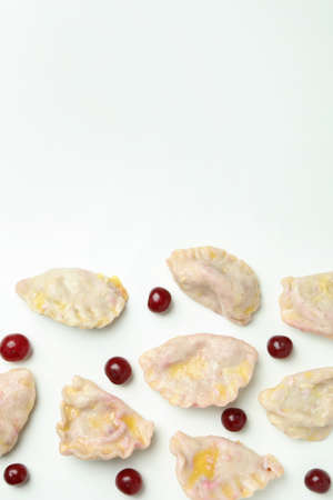 Pierogi with cherry on white background, space for text