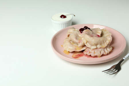 Plate with pierogi with cherry on white background