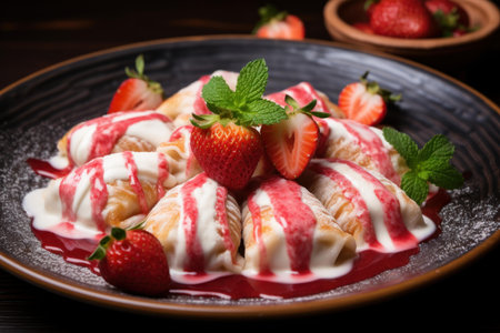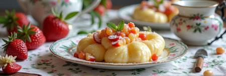Delicious sweet dumplings with fresh strawberries and mint on floral dishware. That the image is generated using AI.