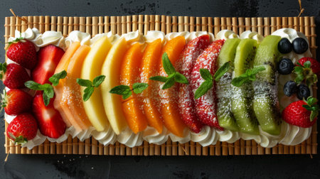 Dessert sushi plating on a bamboo mat with fruit and cream