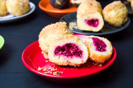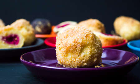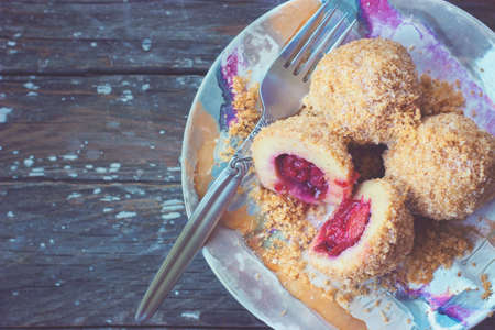 Plum dumplings on colorful plate on wooden bckground