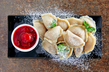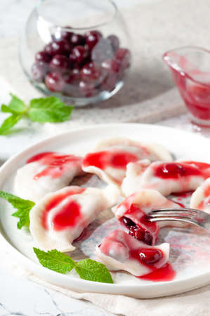 hot dessert. Cherry dumplings with sweet sauce. Vegetarian food.