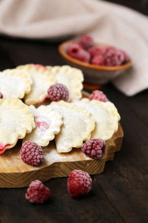 dumplings with berries on a wooden board