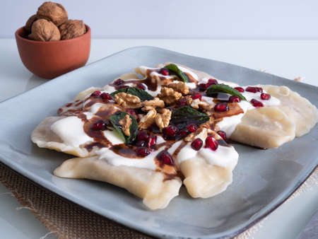 dumplings on a plate sprinkled with nuts, chocolate and decorated with fresh mint leaves