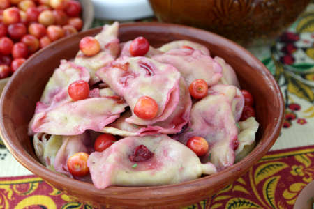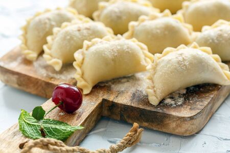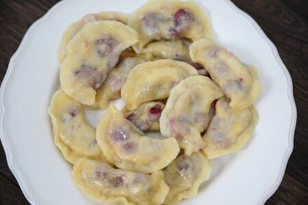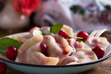 Dumplings, filled with cherries. Varenyky, vareniki, pierogi, pyrohy - dumplings with filling