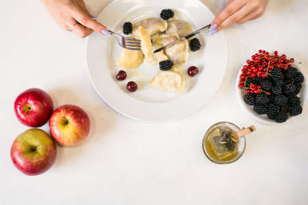 Ukrainian varenyky with cherries in a white plate of white tablecloth. hard light. selective focus. close-up