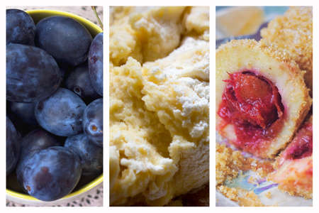 Plum dumplings collage - Fresh plums, potato dough and finished plum dumplings as collage; Triptych kitchen decoration