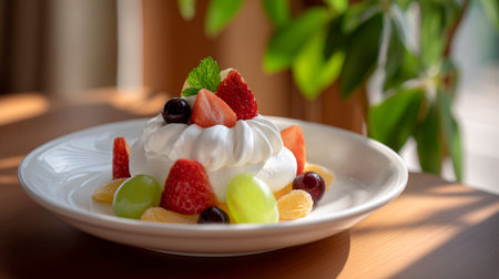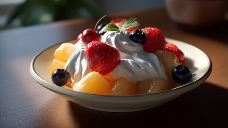 A delicious fruit salad with whipped cream on a wooden table indoors