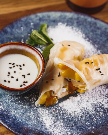 Rice Spring rolls Nem with fruits and sweet sauce in plate on wooden table. Asian Vietnamese food snack.
