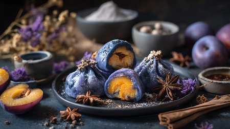 Top view of a colorful plate with plum dumplings