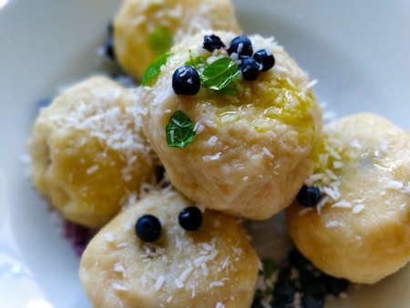 Detail image of home-made blueberry dumplings.