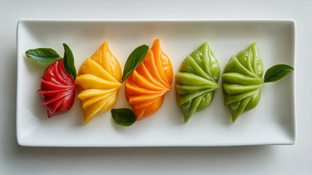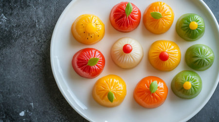 A stunning display of colorful fruit-shaped treats arranged on a white plate, showcasing vibrant colors and elegant presentation for an appealing dessert.