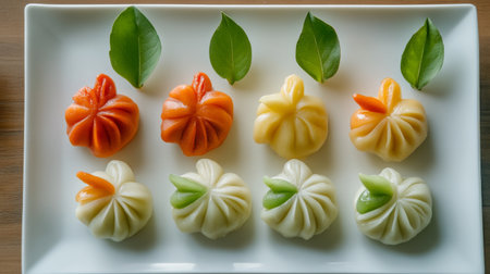 A visually appealing arrangement of freshly steamed dumplings on a plate, accompanied by a cup of tea and surrounded by delicate flowers for an inviting experience.