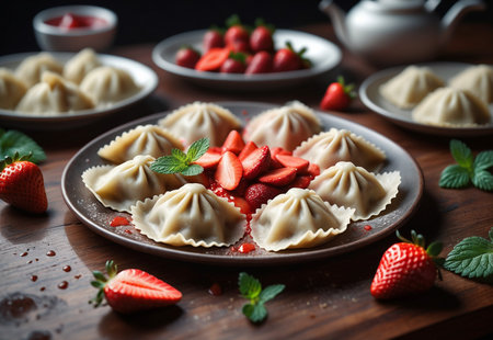 Strawberry vareniki on a wooden table in a rustic style.