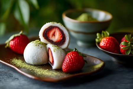 Creative food template. Strawberry Fruit Daifukumochi daifuku mochi rice flour Japanese dessert stuffed red bean with matcha powder on ceramic plates, copy text space