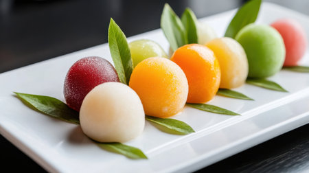 Colorful mochi spheres placed neatly on a white plate, complemented by natural leaf decorations