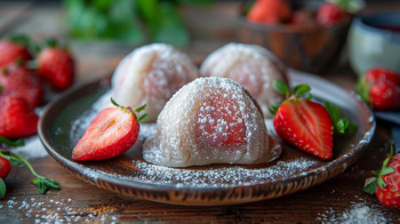 food presentation, rustic table adorned with delicious homemade strawberry mochi dumplings, filled with sweetness and dusted with powdered sugar