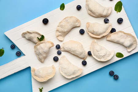 Board with raw dumplings and blueberries on color background