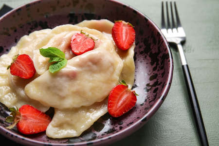 Plate with tasty strawberry dumplings on color wooden background, closeup