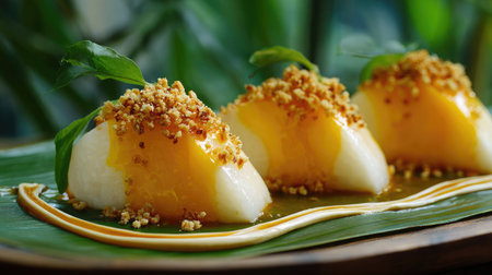 Focused shot of mango sticky rice with golden toasted mung beans and creamy sauce swirl