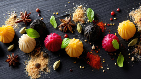 This image showcases a vibrant assortment of Asian dumplings arranged on a black slate surface, surrounded by various spices and herbs.