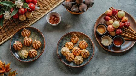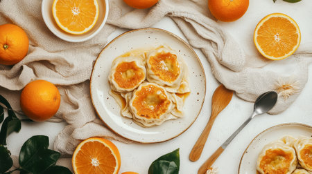 Overhead View of a Neatly Arranged Table with Dumplings and Fresh Oranges Concept of Culinary Art, Fresh Ingredients, Food Presentation, and Cozy Home Dining. Chinese New Year.