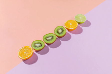 Kiwi and citrus fruits are placed in a diagonal line on a pink and orange background.