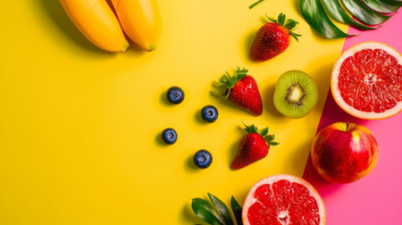 Assorted colorful fruits like bananas, strawberries, blueberries, and kiwi arranged on a vibrant yellow and pink background.