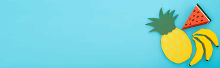top view of paper summer fruits on blue background, panoramic shot
