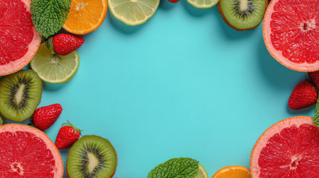 A vibrant arrangement of fresh fruits including grapefruit, strawberries, kiwi, and limes against a bright blue background, highlighting healthy eating and freshness.