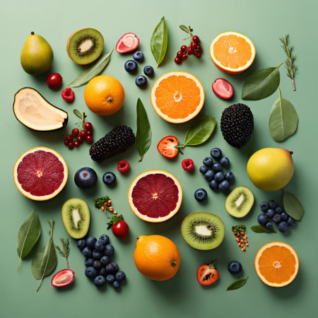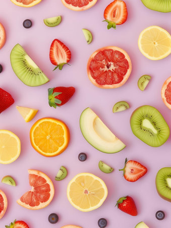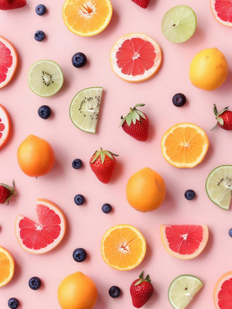 A vibrant array of fresh fruits and berries is artistically arranged against a soft pastel background, showing a clean and minimal aesthetic.