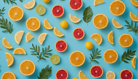 A vibrant flat lay of assorted citrus fruit slices and whole fruits with green leaves on a blue background.