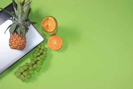 Home office, remote work on computer, laptop and fruits, minimal business and online learning concept. Stay home during a pandemic, protect yourself, view from above,
