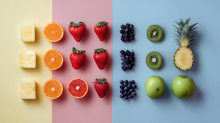 Arrangement of assorted fresh fruits on tricolor geometric backdrop, vibrant and vitamin-rich.