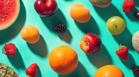 Discover a vibrant display of assorted fruits on an aquamarine background, perfect for showcasing nutrition and health concepts in culinary art and food photography.