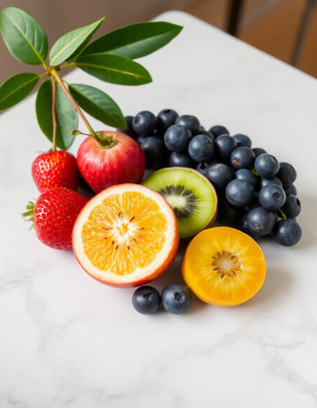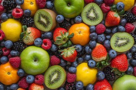 Assorted fresh fruits including strawberries, oranges, kiwis, apples, and blueberries, arranged in a vibrant and colorful composition. Perfect for healthy eating and food themes.