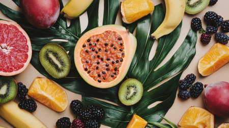A colorful assortment of tropical fruits, including papaya, passion fruit, and kiwi, arranged on a vibrant green surface.