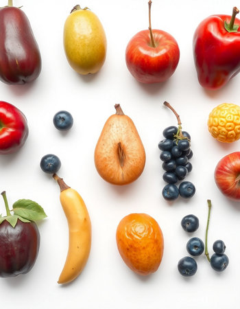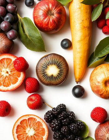 Overhead shot of a selection of fresh fruits, arranged in a flat lay style, with a focus on the vibrant colors and textures of each fruit